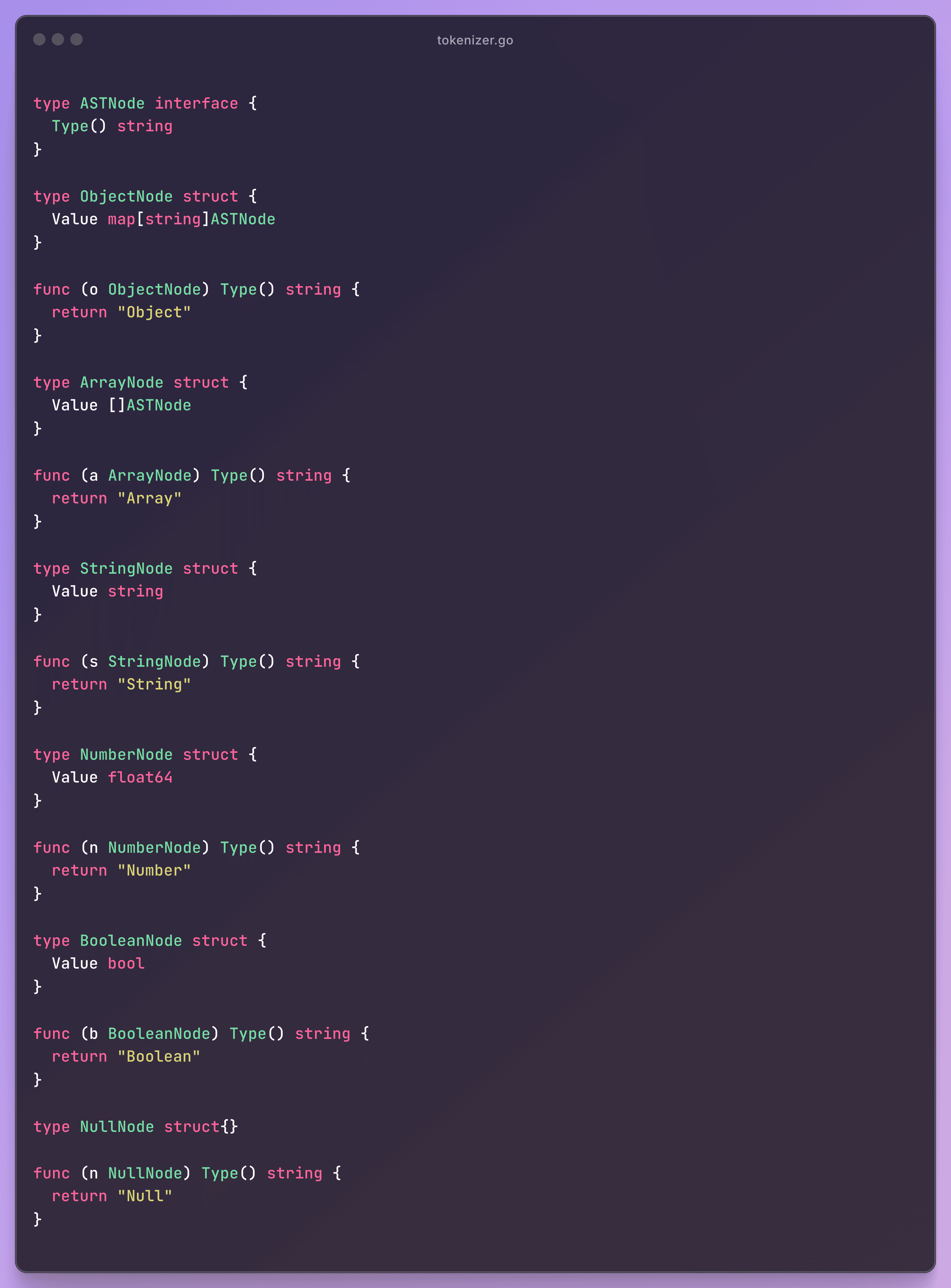 This is the base interface for all AST node types. Every node will implement the Type() method, which is a simple way to identify what kind of data (Object, Array, String, etc.) it holds.
