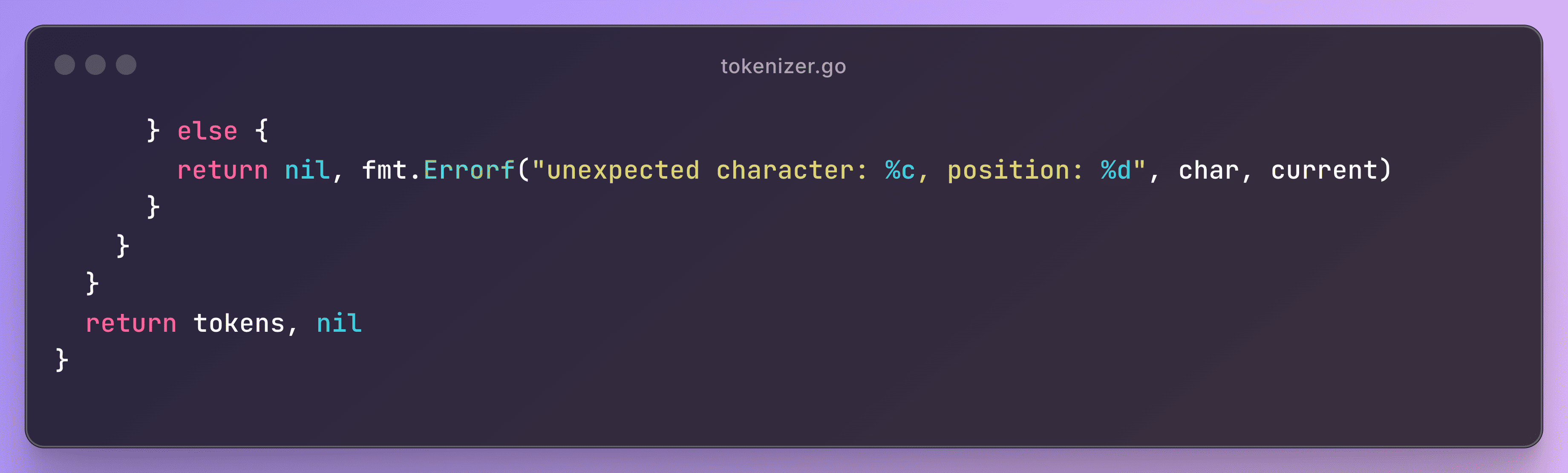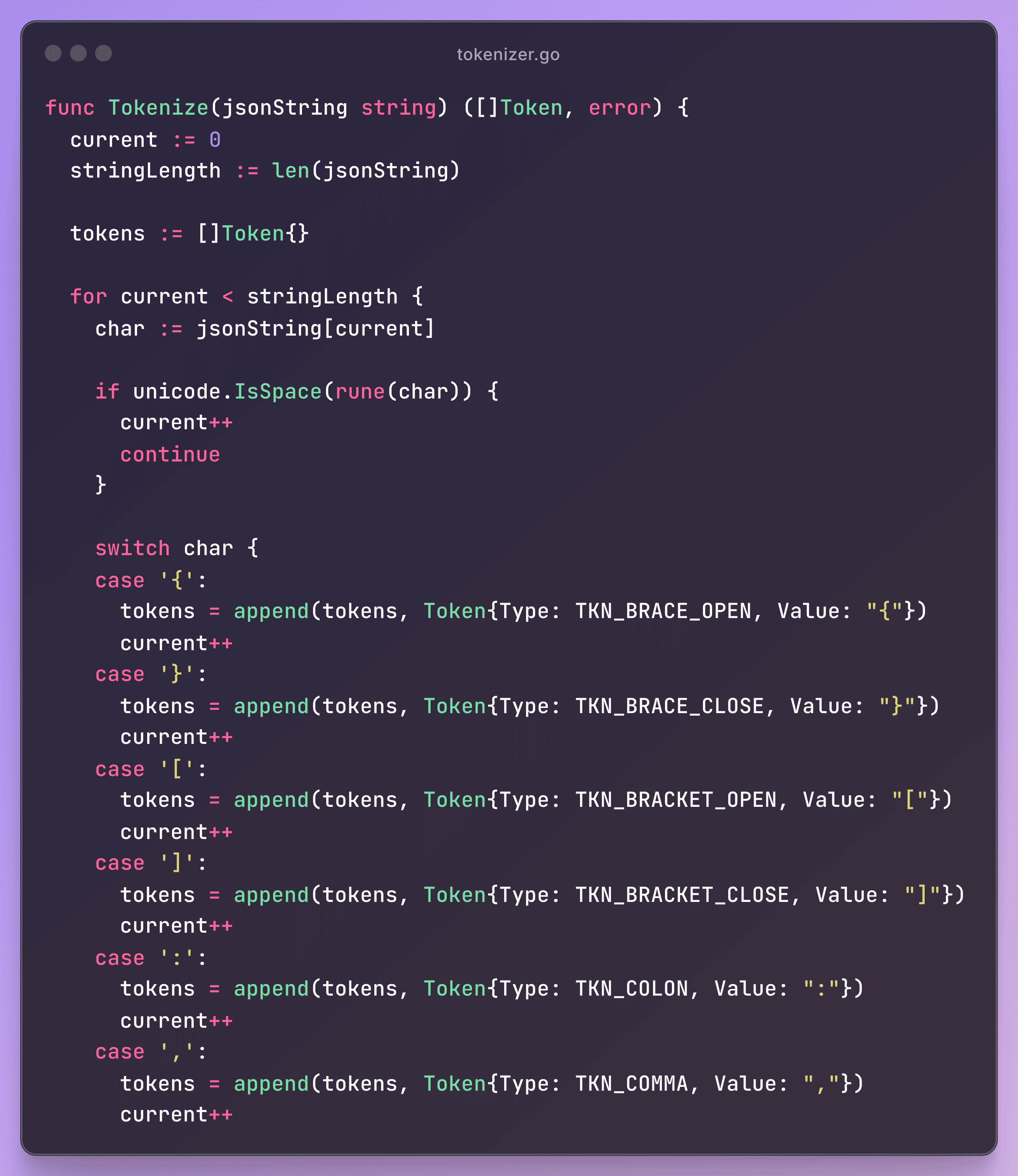 We start with a current pointer to keep track of where we are in the string. stringLength helps us not go out of bounds, and tokens is the slice where we’ll collect all the tokens we generate.