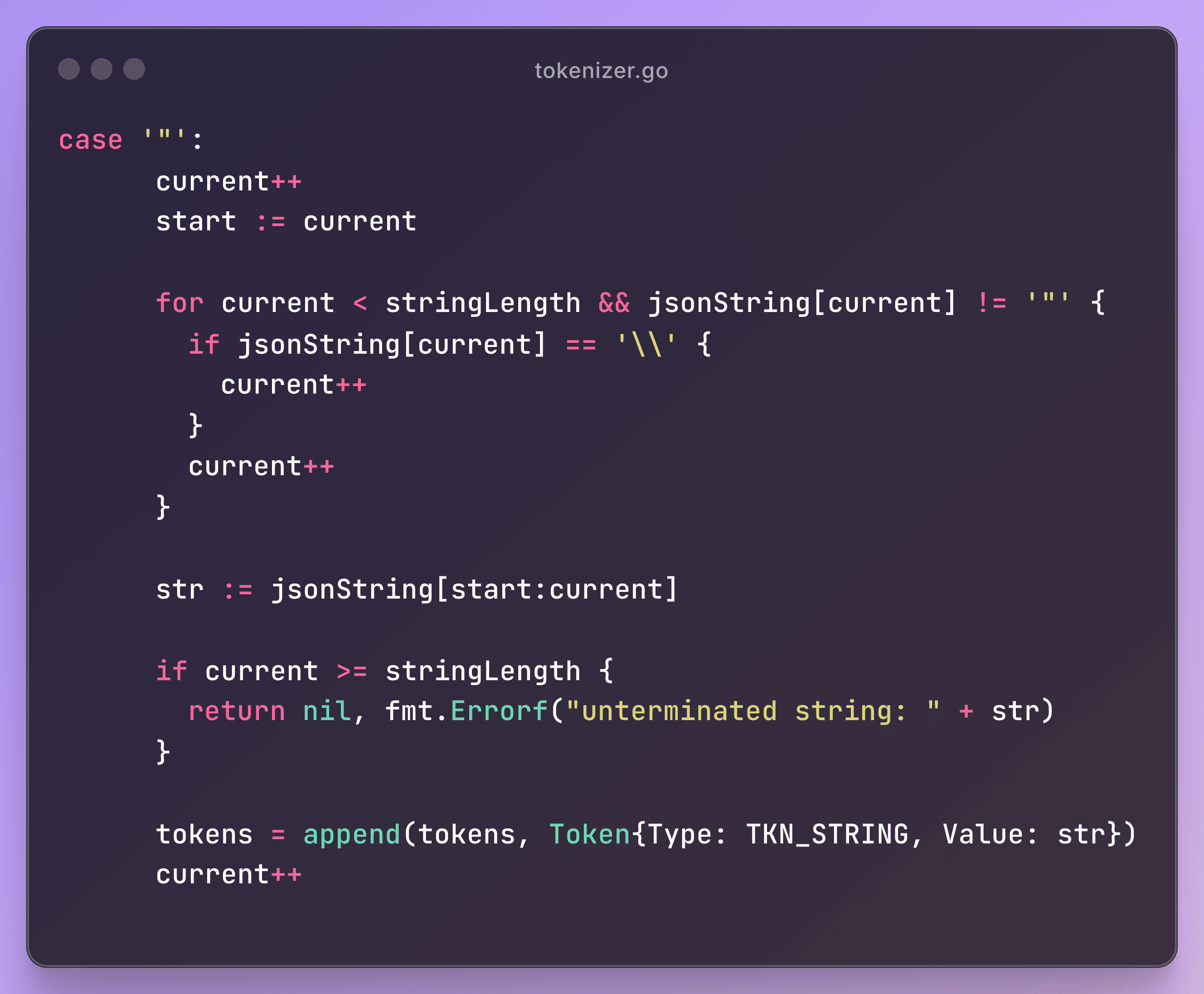 When we encounter a ", we start reading a string. We look for the closing quote, while also making sure to skip escaped quotes like \". If the string is never closed, we throw an error. Otherwise, we extract the string and add it as a token.