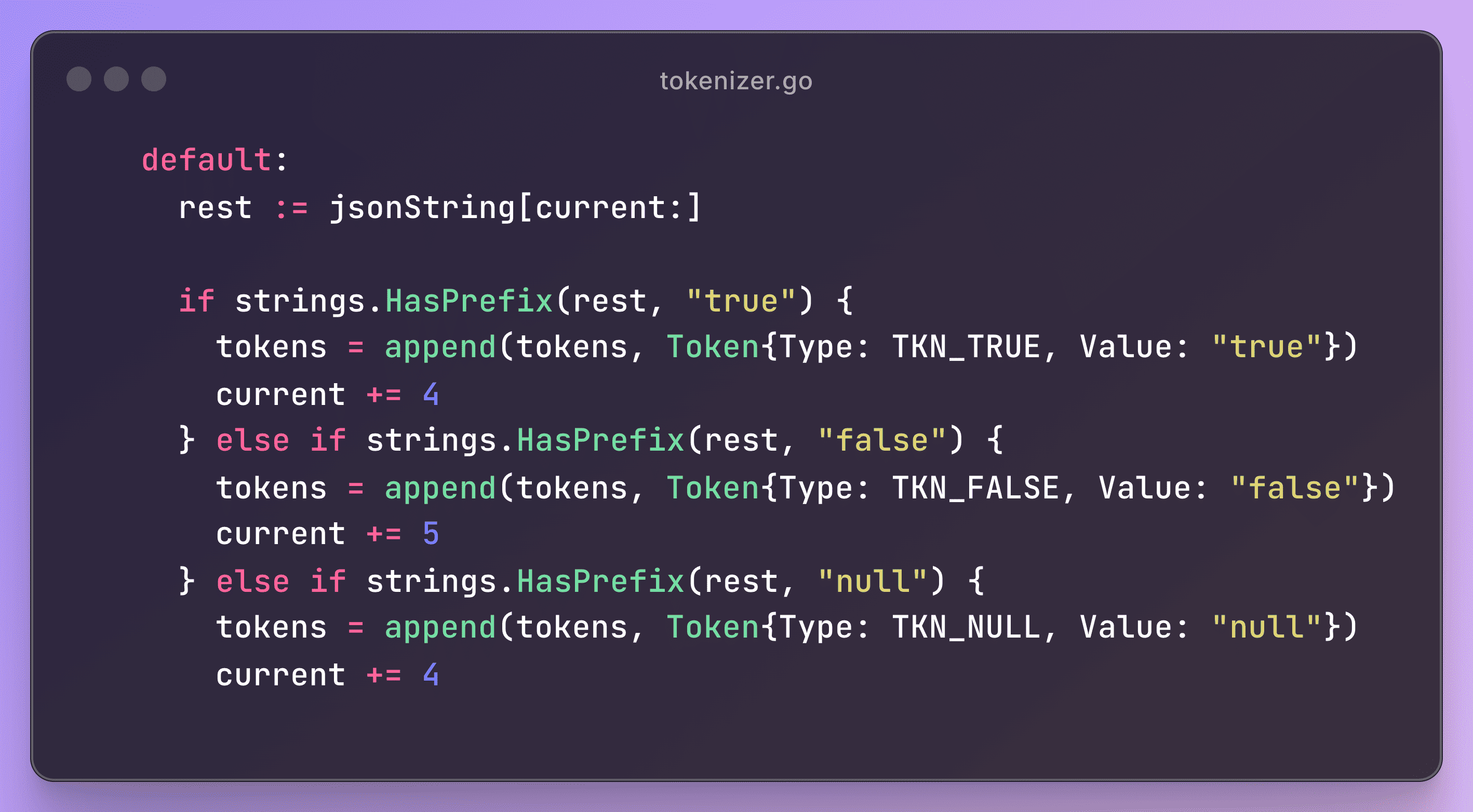 We check for true, false, and null first. If we see one of these keywords, we push it to the tokens list and jump ahead accordingly.