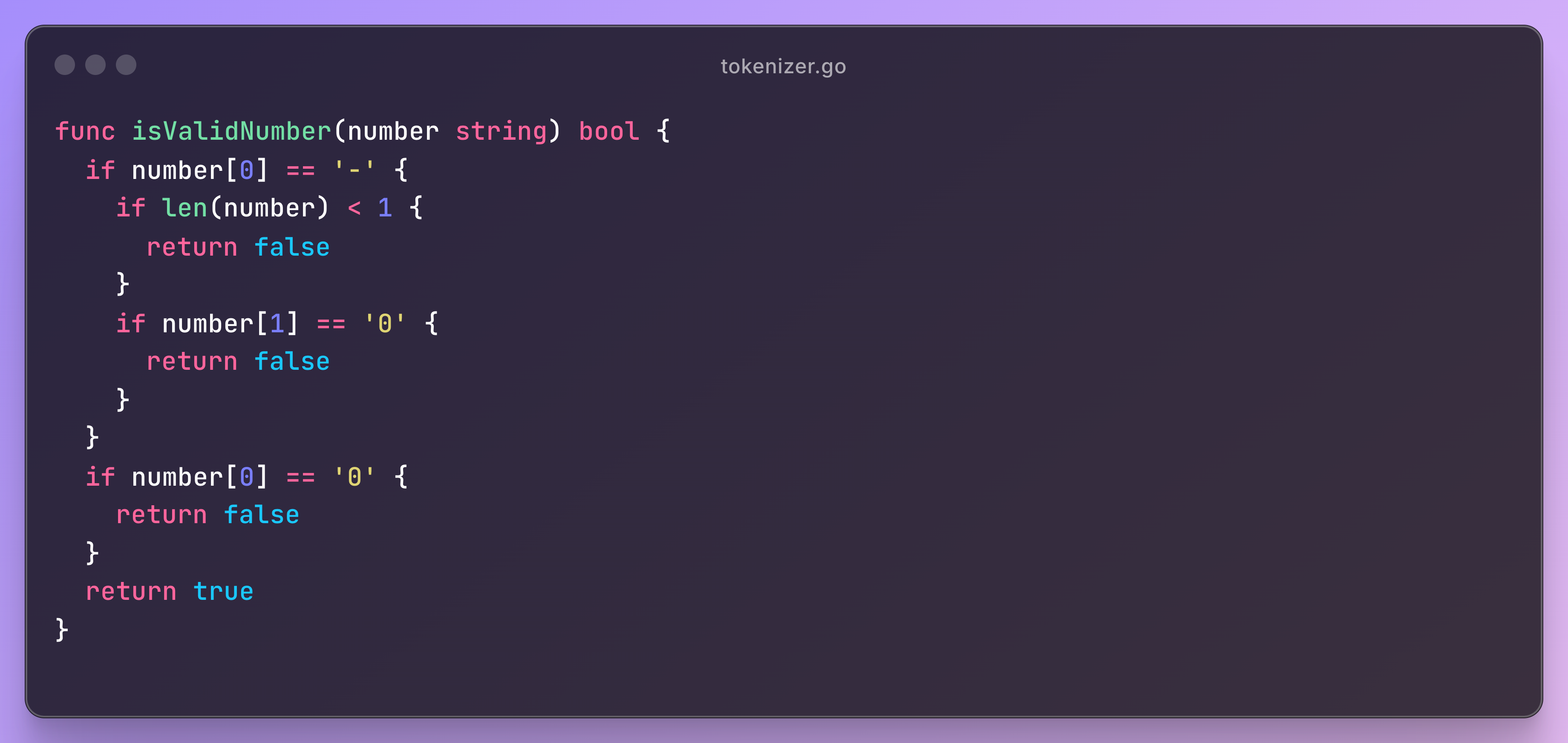 JSON numbers can get complex. They might contain decimals, negative signs, and exponential notation (like 1.2e+10). We carefully walk through each character to build the number string. I also added validations to reject bad formats like 00, multiple dots, or missing exponent digits.