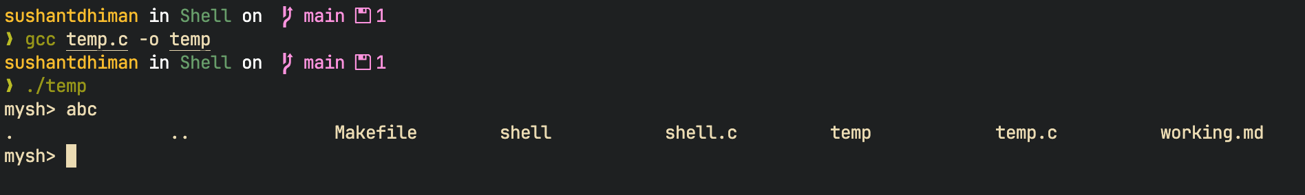 Let's say a user entered the "ls" command in our shell. This command will print all the files and folders in the current directory.